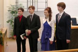 Nach der Sündenvergebung und einem Lied des Chores folgte dann die Konfirmationshandlung, zu der die vier Konfirmanden an den Altar traten. Dort bekundeten sie mit einem feierlichen Gelübde, Gott treu zu sein, und empfingen den Segen Gottes, des Vaters, des Sohnes und des Heiligen Geistes.