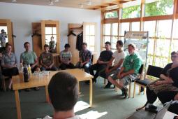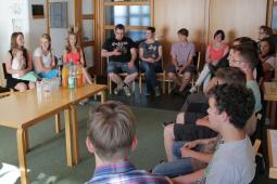 Da der Gemeinderaum zu Beginn um 17.00 Uhr durch die Nachmittagssonne noch sehr aufgeheizt war, wich man auf den etwas kühleren Vorraum aus und bildete dort einen großen Stuhlkreis mit zwanzig Jugendlichen und zwei Jugendleitern.