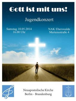 Am Samstag, dem 10. Mai 2014, um 16.00 Uhr findet in der Neuapostolischen Kirche Eberswalde, Mertensstraße 4 in 16225 Eberswalde, ein Jugendkonzert des Bezirkes Eberswalde statt. Es steht unter dem Motto „Gott ist mit uns!“