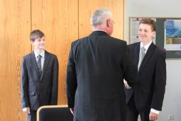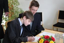 Etwas Aufregung war schon zu verspüren, als die beiden Konfirmanden, Johannes Behnisch aus der Gemeinde Finowfurt und Florian Härm aus der Gemeinde Finow vor dem Gottesdienst das Ämterzimmer betraten und dort durch den Bezirksapostel begrüßt wurden. Zunächst galt es, mit eigener Unterschrift die Glaubensmündigkeit zu bekunden.