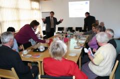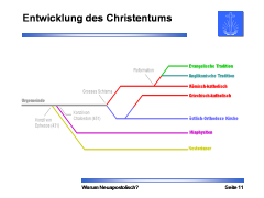 Durch den Abend führte Gemeindevorsteher Matthias Steinberg anhand einer Präsentation, die die Entwicklung des Christentums von der Urgemeinde bis zur heutigen Zeit veranschaulichte. Gezeigt wurden die territoriale Ausbreitung der einzelnen Kirchen und Konfessionen, ihre Mitgliederzahlen sowie wesentliche Inhalte der Glaubenslehre und des Sakramentsverständnisses.